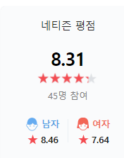 - 영화 스파이의 아내 네이버 평점은 45명 참여 8.31점입니다.